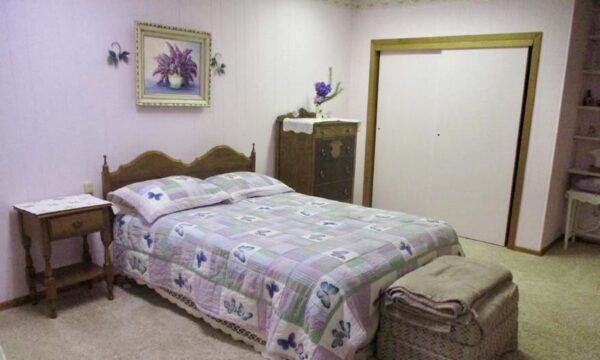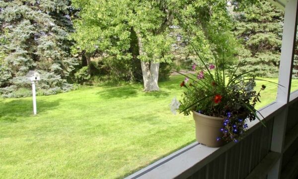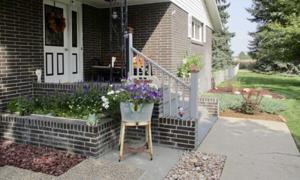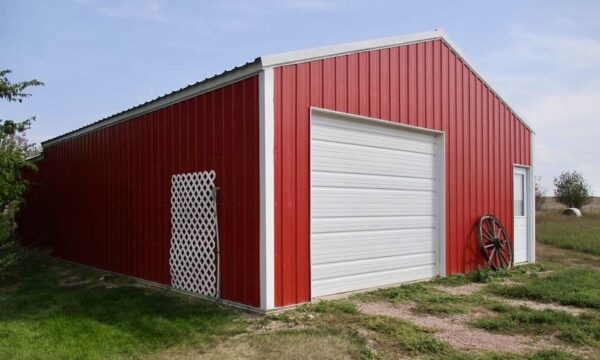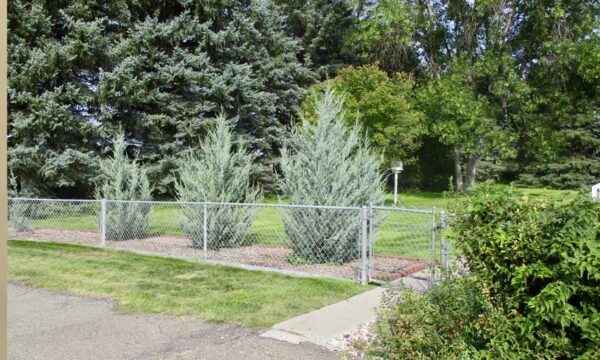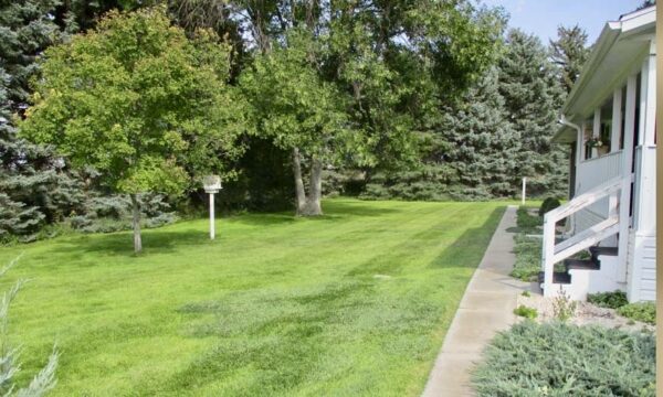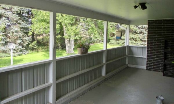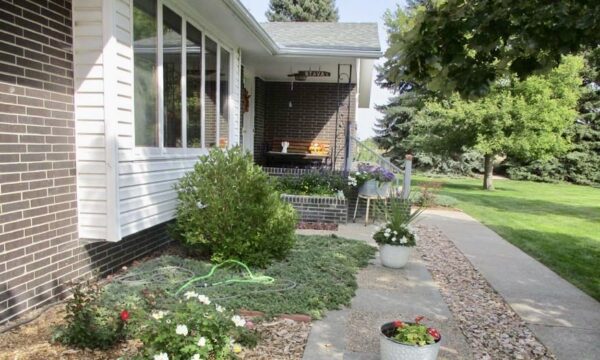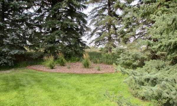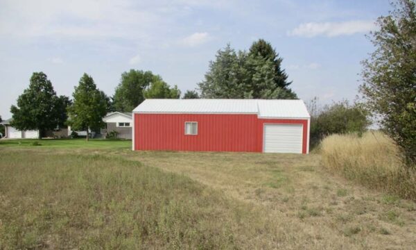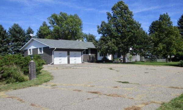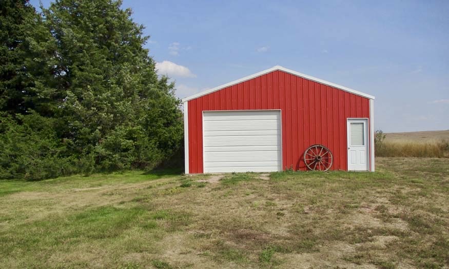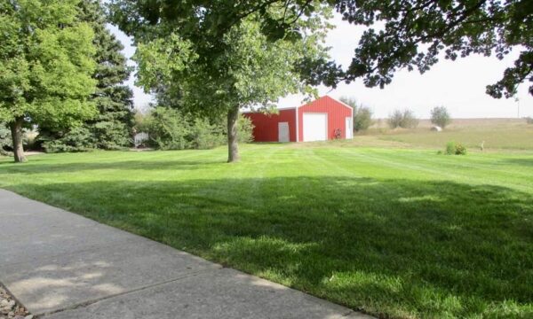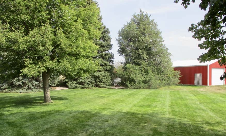 Outdoors, the acreage is set up for both relaxation and utility. A red outbuilding with overhead door provides room for equipment, hobbies, or workshop space. The two-stall attached garage, paved driveway, fenced yard, and thoughtful landscaping add to the property’s functionality.