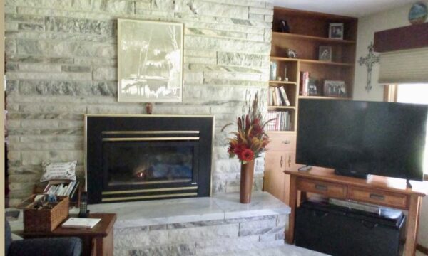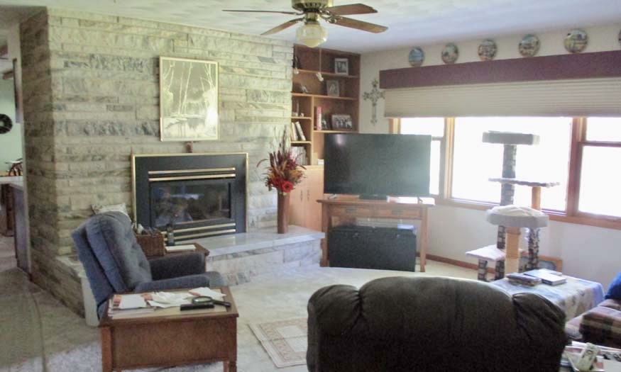 Inside, the main level boasts a spacious living room centered around a marble fireplace and custom built-in shelving. A bright formal dining area and large eat-in kitchen provide plenty of room for family gatherings. The home includes a dedicated laundry room, abundant built-in storage, and two main-level bathrooms showcasing timeless tilework in excellent condition.
