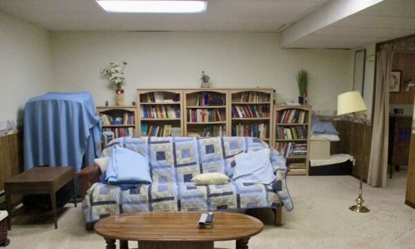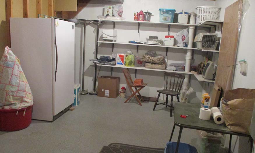 The finished basement extends the living space with multiple family/rec rooms, a wall of bookshelves, additional bedrooms, bathroom, and extensive storage options — including built-in shelving, utility rooms, and even a secure safe.